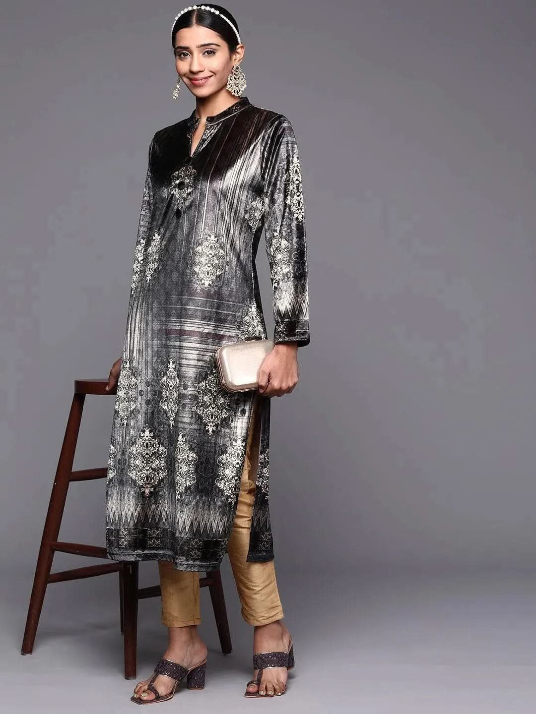 Grey Printed Velvet Straight Kurta